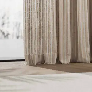 €0,00Cosiness sets the pace here. Drapery fabric Gunta applies a relaxed ?soft focus lens? to its 34 mm wide, vertically inclined striped pattern: the wool bouclé yarn blurs the strict linearity of this design classic to project a homey casual chic. Fibres and colour scheme amplify this feeling with natural wool and linen variations, whose handcrafted character brings warmth to the room. Suitable for reverse use in lightweight draperies or Roman blinds, the natural fabric creates warm atmosphere in interiors.