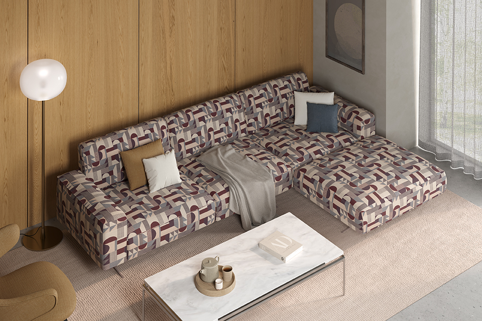 Mapping out a new dawn. Olmo combines the colour palette of a sunrise with a geometric mosaic, giving the Aurora collection its distinctive look in the upholstery fabric segment. A modern take on a classic tapestry fabric, it brings warm tones from four colour worlds to its cubic contrasts. Mediterranean siena, earthy tabac, floral orchid and fashionable bordeaux each unfold their unique charm on a heavy linen-cotton weave with a grainy texture.