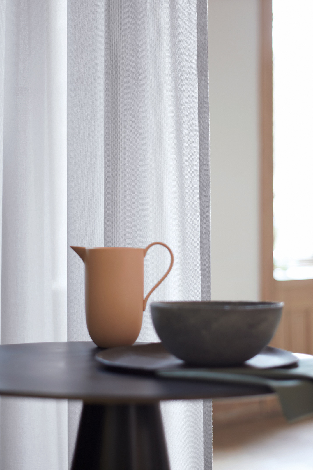 A mi chemin entre voile et double rideau, un tissu prometteur qui vient se présenter dans des teintes nature, en blanc et dans une nuance aubergine. Belano tire son aspect crêpé façon laine et son toucher agréable de la proportion relativement importante de laine. Avec 60% de polyester difficilement inflammable et 40% de laine, ce tissu d’ameublement répond parfaitement aux exigences de l’équipement de collectivités.